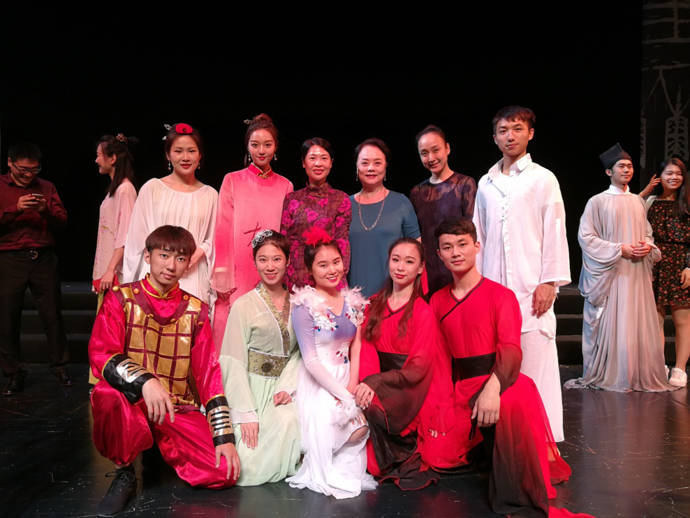 据了解受鳟鱼歌剧艺术团的邀请,艺术学院艺术管理与舞蹈系主任马威威老师参与此次舞蹈编排工作,舞蹈表演班与音乐表演班的部分学生参与了此次演出。在排练演阶段,师生克服种种困难,全情投入艺术创作;演出期间,大家激情饱满,倾情演绎,以动人的歌声和唯美的舞蹈,使诗歌剧精彩纷呈,高潮迭起,赢得观众热烈掌声和一致好评!鳟鱼歌剧艺术团团长、著名声乐表演艺术家邓韵老师高度赞扬艺术学院参演师生艺术修养好、专业技术强、能力素质高。朱珍葶书记充分肯定了参演是生的各项工作,并表示:“这次实践演出为艺术学院学生搭建了很好的舞台艺术实践平台,是对学生专业实践能力的有益锻炼与提升”。