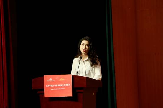 我院上一任学生会主席、2015级黄芷芊同学代表老生发言中,以学姐过来人的身份,告诉同学们要“努力实践去收获自信与可能”,“比你优秀的人比你还要更努力”,“在无限大的舞台上发光发热”,向大家展示了榜样的力量。来自视觉传达专业的陈润科代表18级新生发言,她告诉同学们:年轻就应该为自己的梦想而拼搏,“如果一个人不逼自己一次你永远不知道自己有多优秀”,她呼吁大家,要学习更多知识,利用好大学更广阔的平台,严格坚守校园纪律,严于律己,努力成为国家栋梁之才。