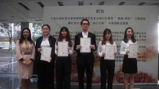 12月26日上午,广东外语外贸大学培育和践行社会主义核心价值观“铸魂•系扣”工程项目暨红色文化节之“初心之路”书画摄影主题展在我校艺术楼一楼展厅开幕。展览由我校党委宣传部主办,我院承办。校党委常委、副校长刘海春,艺术家代表,校党委宣传部部长谢秀兰,校特聘组织员代表,校团委的领导,二级学院党委、图书馆党总支部的书记、副书记,以及艺术学院师生代表出席了开幕式。开幕式由学院党总支书记麦培年主持。