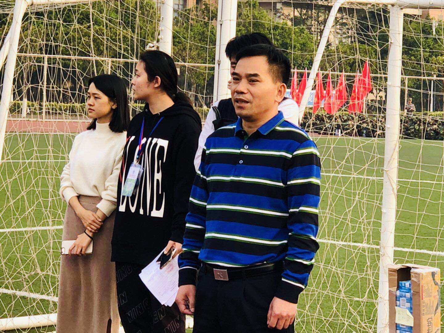 为鼓励艺术学院2018级新生坚定理想信念、磨炼意志品质、提升身体素质,掌握新生的军事训练实际情况,2019年1月14日16时30分,艺术学院党总支书记麦培年、副院长(主持工作)王凯宏、副院长陈燕敏、党总支副书记张莉、团委书记邓煜、16级辅导员谭珺如、新生辅导员丁恒晏、团学主要干部以及新生朋辈导师一行来到南校足球场慰问正在进行军训的新生和教官们。