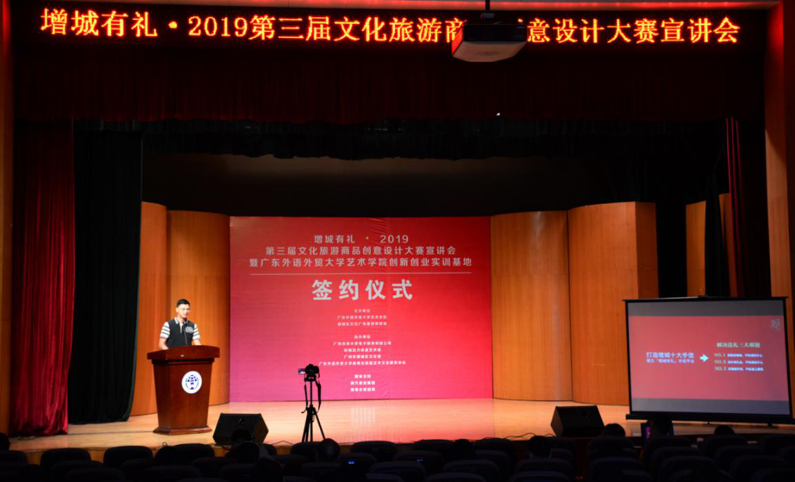 6月19日下午,2019增城第三届文化旅游商品创意设计大赛宣讲会暨广东外语外贸大学艺术学院创新创业实训基地签约仪式在我院举行,增城区文化广电旅游体育局、区旅游发展中心、区文化馆主要负责人,南方报业集团、广州大湾区文化促进中心相关负责人,艺术学院党总支书记麦培年、主持工作副院长王凯宏、副院长李志刚、陈燕敏、总支书记副书记张莉以及艺术学院部分师生参与活动。