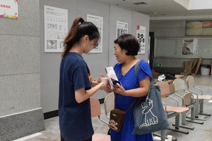 志愿者为等待的家长递上饮用水