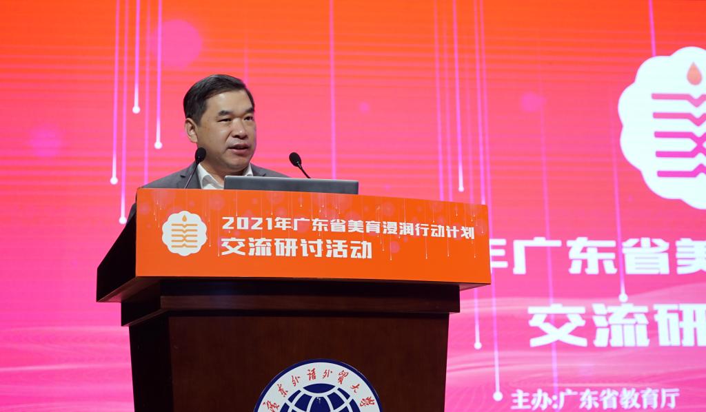 2020年1月7日广东省教育厅美育浸润行动计划现场交流研讨活动在广东外语外贸大学艺术学院举行。本次活动由广东省教育厅主办,广东外语外贸大学承办,广东外语外贸大学艺术学院协办。广东省教育厅二级巡视员邱克楠,广东省教育厅体卫艺处处长陈健生,广东省教育厅体卫艺处三级调研员康天东,广东省美育教育教指委主任、星海音乐学院院长蔡乔中,广东外语外贸大学副校长焦方太,广东省教育厅美育浸润行动计划参与高校校领导,各高校美育浸润行动计划具体负责人,18个美育对口帮扶地区教育局领导等100余人参与了此次会议。