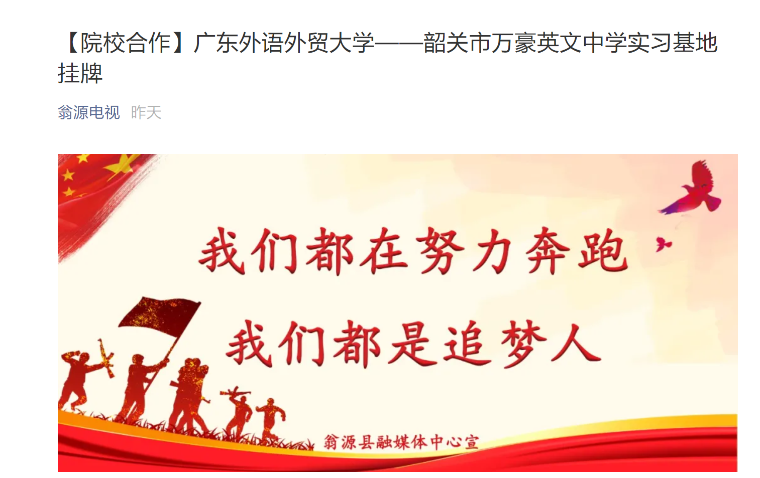 5月22日,广东外语外贸大学——韶关市万豪英文中学实习基地挂牌仪式在万豪英文中学校园中心广场举行。