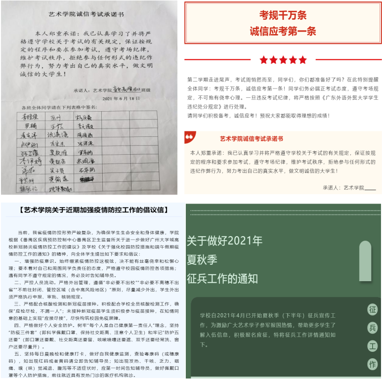 在学生考风考纪暨疫情防控教育工作中,艺术学院除召开年级大会外,还组织学生签订了《诚信考试承诺书》,在团学公众号推出了关于诚信考试、加强疫情防控和应征入伍等推文,多措并举推进学生工作。