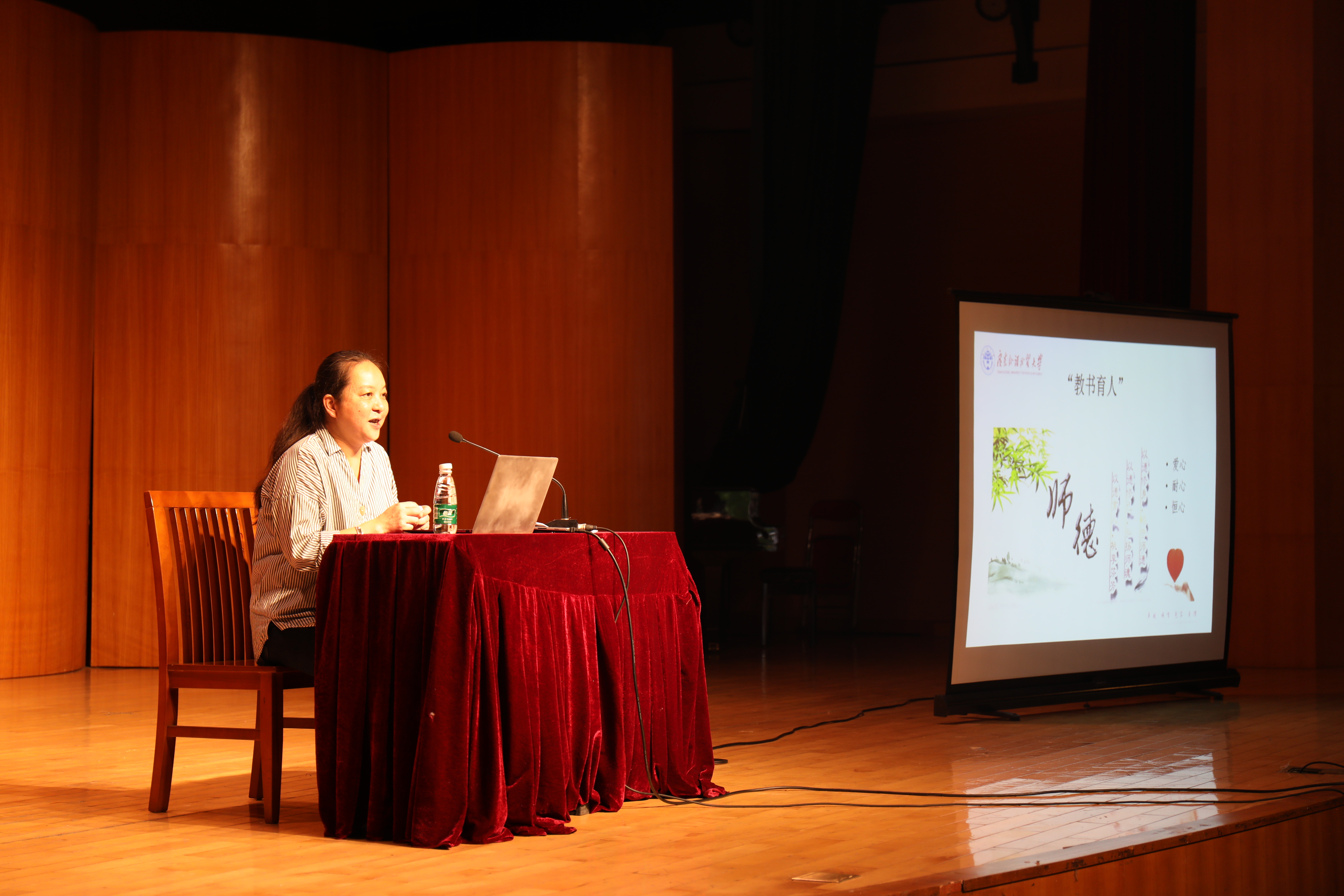 杨晓敏教授宣讲的主题是“教书育人 ,做新时代的人民教师”。杨教授从“师德的定义”讲起,引用唐·韩愈《师说》:“古之学者必有师。师者,所以传道受业解惑也。”,习近平总书记对教育的重要论述:“我们的教育必须把培养社会主义建设者和接班人作为根本任务,培养一代又一代拥护中国共产党领导和我国社会主义制度、立志为中国特色社会主义奋斗终生的有用人才。”对教师提出的五个“下功夫”:“要在坚定理想信念上下功夫”、“要在厚植爱国主义情怀上下功夫”、“要在加强品德修养上下功夫”、“要在增长知识见识上下功夫”、“要在增强综合素质上下功夫”,阐述了“教书育人”的含义。结合《高等学校教师职业道德规范》要求:“爱国守法”、“敬业爱生”、“教书育人”、“严谨治学”、“服务社会”、“为人师表”,对教师提出明确的工作要求。