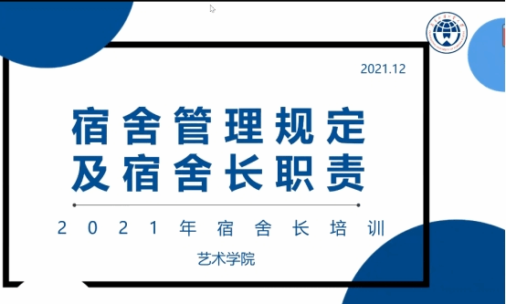 12月2日晚,艺术学院按照学校2021年宿舍长培训安排,结合学院实际,通过线上方式开展了宿舍管理要求、宿舍文明建设等两个专题的培训,辅导员谭珺如、林锦松主讲,学院全体宿舍长参加。