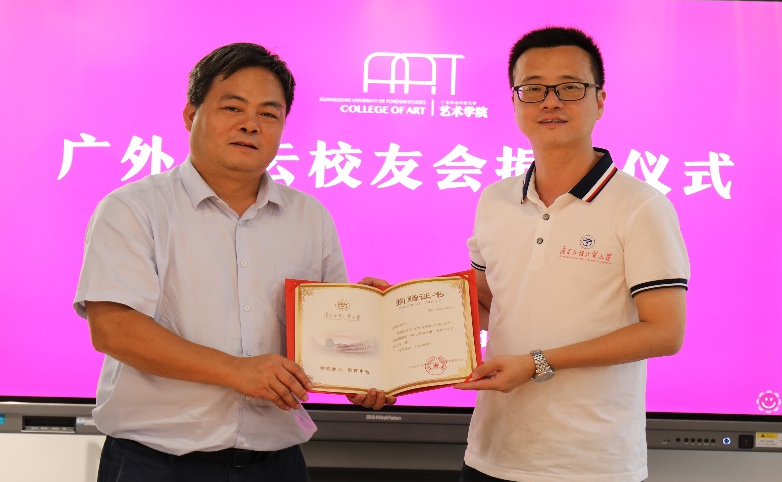2022年7月1日,广东外语外贸大学白云校友会捐赠仪式在南校区艺术学院举行。广外白云校友会执行会长郑壁奎、秘书长邱俊辉、广东省家居建材商会秘书长杨传辉、艺术学院副院长(主持工作)王凯宏、校友事务与合作发展处处长谢文新、艺术学院副院长李志刚、副院长陈燕敏、党总支副书记连勇出席了捐赠仪式。仪式由艺术学院党总支书记卢海清主持。