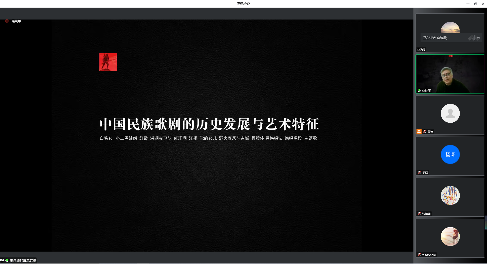 李诗原教授教授首先从广义和狭义两方面厘清了“中国民族歌剧”的定义及其内涵与外延。中国民族歌剧的定义在当下学术界争议颇多,李诗原教授认为中国民族歌剧是一种借鉴中国戏曲表现形式,主要人物唱段多采用戏曲板腔体结构,运用民族唱法,整体上追求音乐民族风格和地方特色的中国歌剧。他从中国民族歌剧的历史发展、中国民族歌剧中板腔体唱段的音乐特征、中国民族歌剧中板腔体唱段的艺术表现意义、中国民族歌剧中绝唱唱段的音乐特征、中国民族歌剧中的女性形象及中国民族歌剧的现状与未来几方面阐述了中国民族歌剧在中国歌剧发展进程中的终要作用与地位,在它的发展过程中用一种特殊艺术形式鲜活地反映出中国革命的历史进程,并且发展中积累出的诸如《白毛女》《小二黑结婚》《洪湖赤卫队》《江姐》《党的女儿》《野火春风斗古城》等经典剧目激励着一代又一代的青年人。
