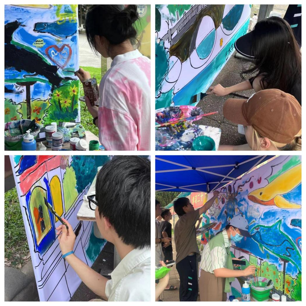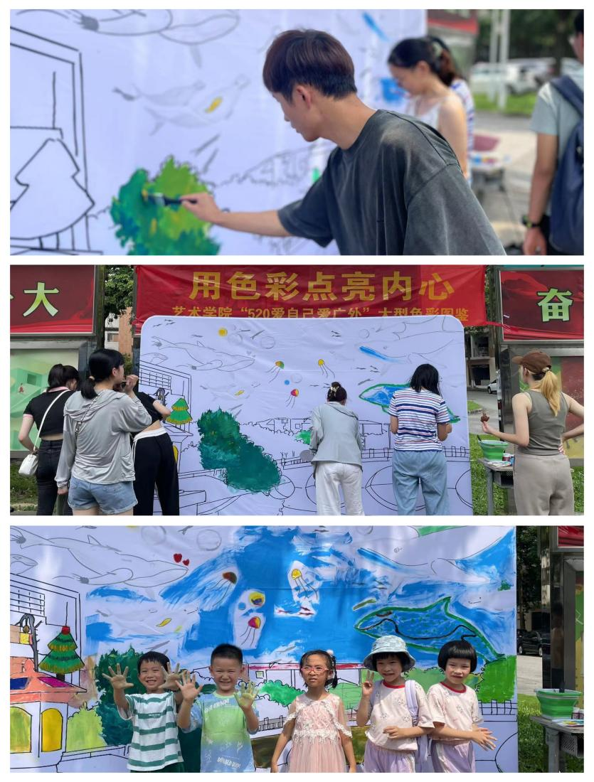 5月20日,艺术学院举办主题为“用色彩点亮内心”大型色彩图鉴活动。活动面向全校师生,在大学城校区生活区校道上举行,该活动也是学院心理活动月的项目之一。活动由艺术设计专业学生设计绘制以校园风景为主基调的图案,制作成大型立地式展板,旁边摆放多色颜料,来自不同学院和部门的师生们汇聚一起,按个人喜好在图案上填色。
