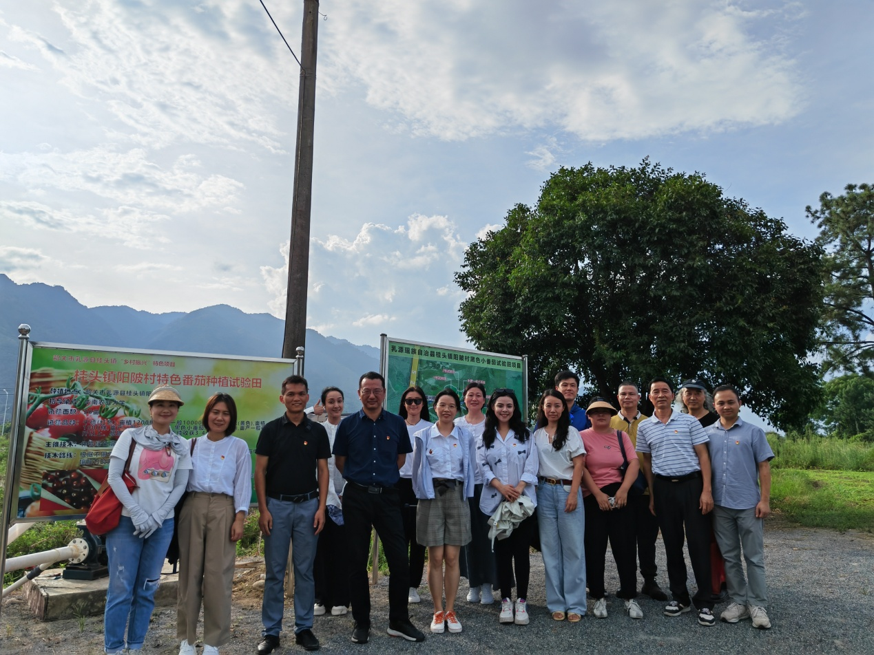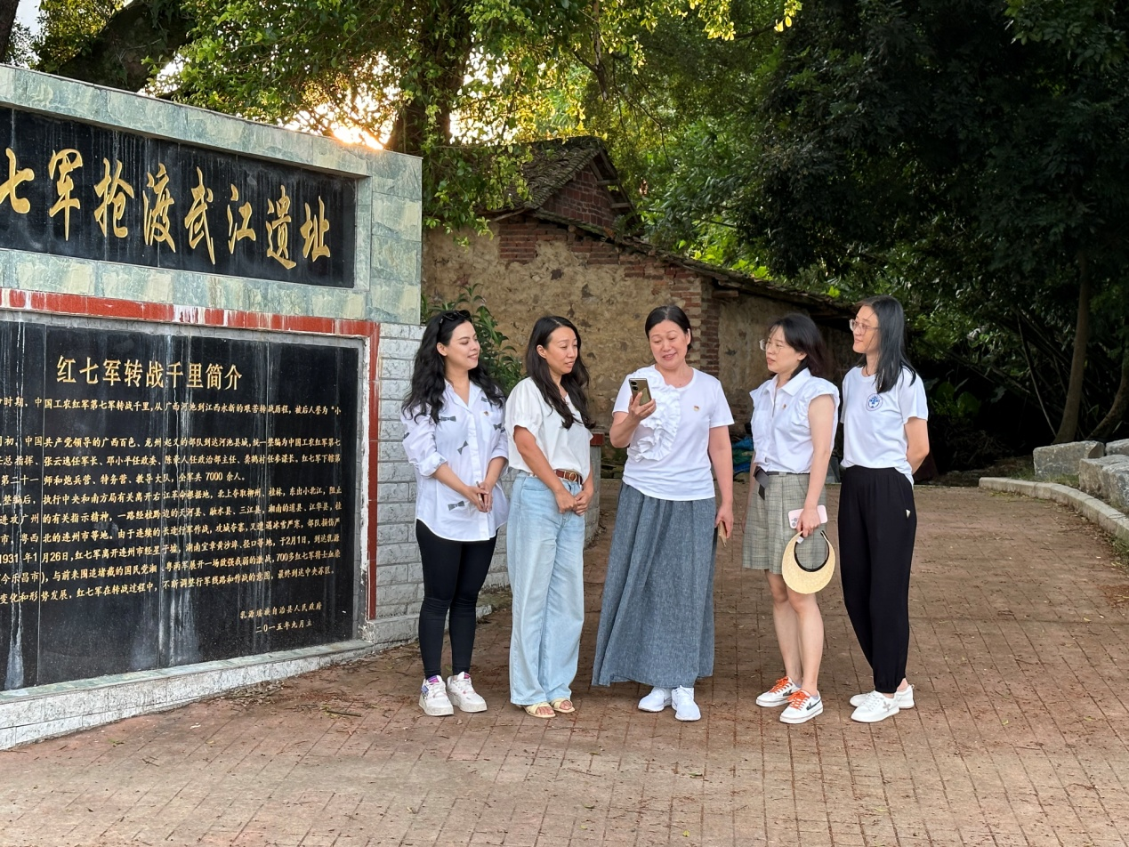 学院党委一行实地考察猴耳环、七彩番茄种植示范田及香芋产业种植等乡村振兴产业重点品牌项目建设情况。在杨溪村红七军抢渡武江遗址,五名音乐系教师党员深情演唱《红军歌》,以专业所长展现当年红七军转战千里、被喻为“小长征”的英雄史诗,老区人民的淳朴善良、军民鱼水情深,令在场的党员们感动不已。此行还参观了国家级非遗项目瑶族刺绣项目,了解过山瑶的民族特色文化和传统技艺,与县级传承人赵咏兰交流瑶族文化内涵,双方拟开展相关设计课程、优秀传统文化国际传播等合作内容。