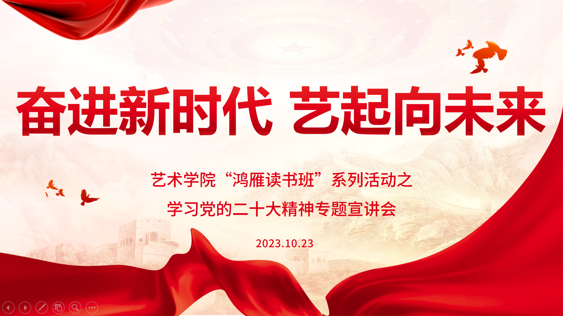 为深入学习贯彻党的二十大精神,提升学生党员的党性修养,凝聚奋进力量,推动“鸿雁读书班”落细落实。10月23、24、25日,艺术学院“鸿雁读书班”系列活动之学习党的二十大精神专题宣讲会在艺术楼A304开展,三位学生党员组成宣讲团面向全院学生进行宣讲。