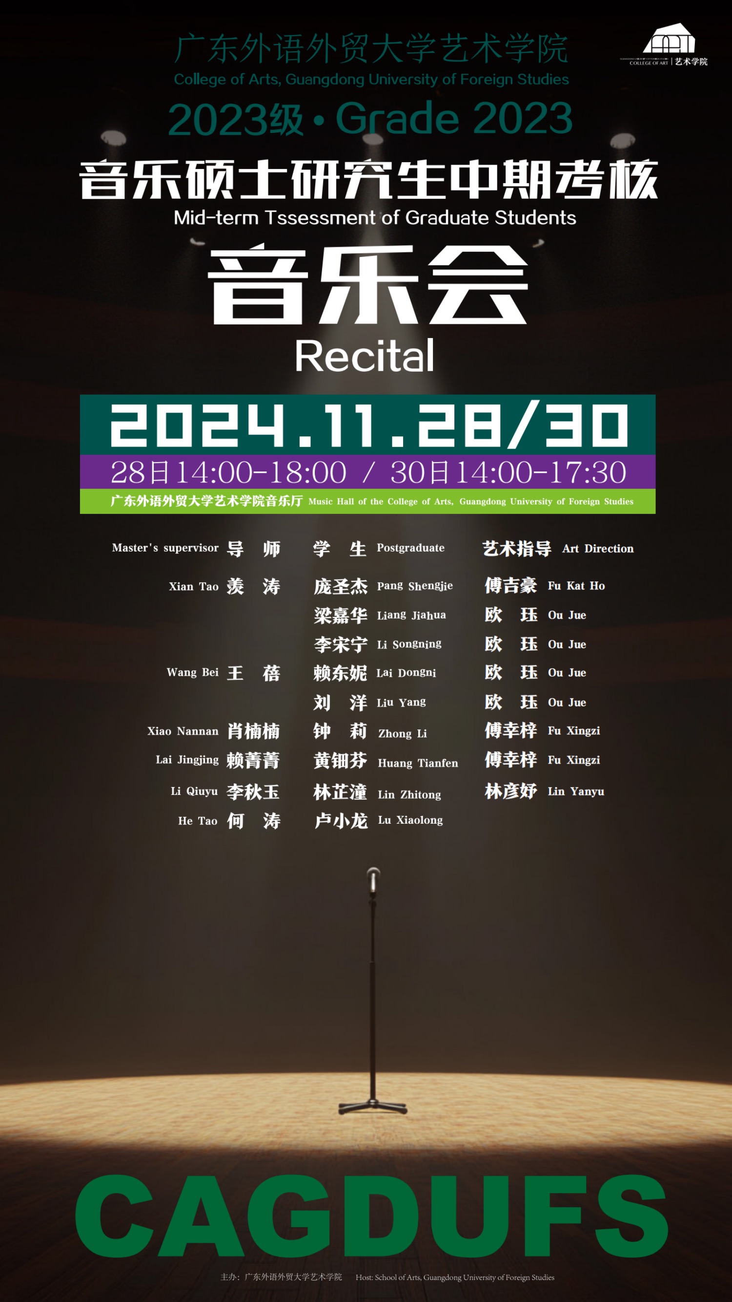 按照教育部《艺术硕士专业学位研究生指导性培养方案(音乐领域)》要求,为了更好地培养具备系统专业知识、高水平专业技能和良好综合素质的艺术专门人才,2024年11月28日和30日下午,广东外语外贸大学艺术学院2023级音乐硕士研究生中期考核音乐会如期举行。艺术学院相关领导、参加音乐会演出学生的硕士导师、专业导师和艺术指导莅临现场参加了音乐会。学院聘请广东省内知名声乐、钢琴表演艺术和音乐教育领域的专家作为中期考核音乐会的评审,充分体现了本次考核的专业性与客观性。