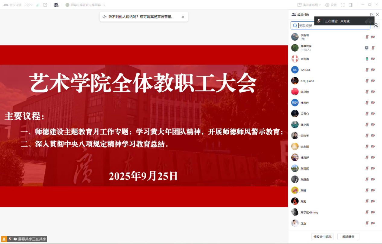 9月25日下午,我院2025-2026学年第一学期师德师风教育大会暨深入贯彻中央八项规定精神学习教育总结会在线上召开。会议由学院党委书记卢海清主持,学院全体教职工参加会议。
