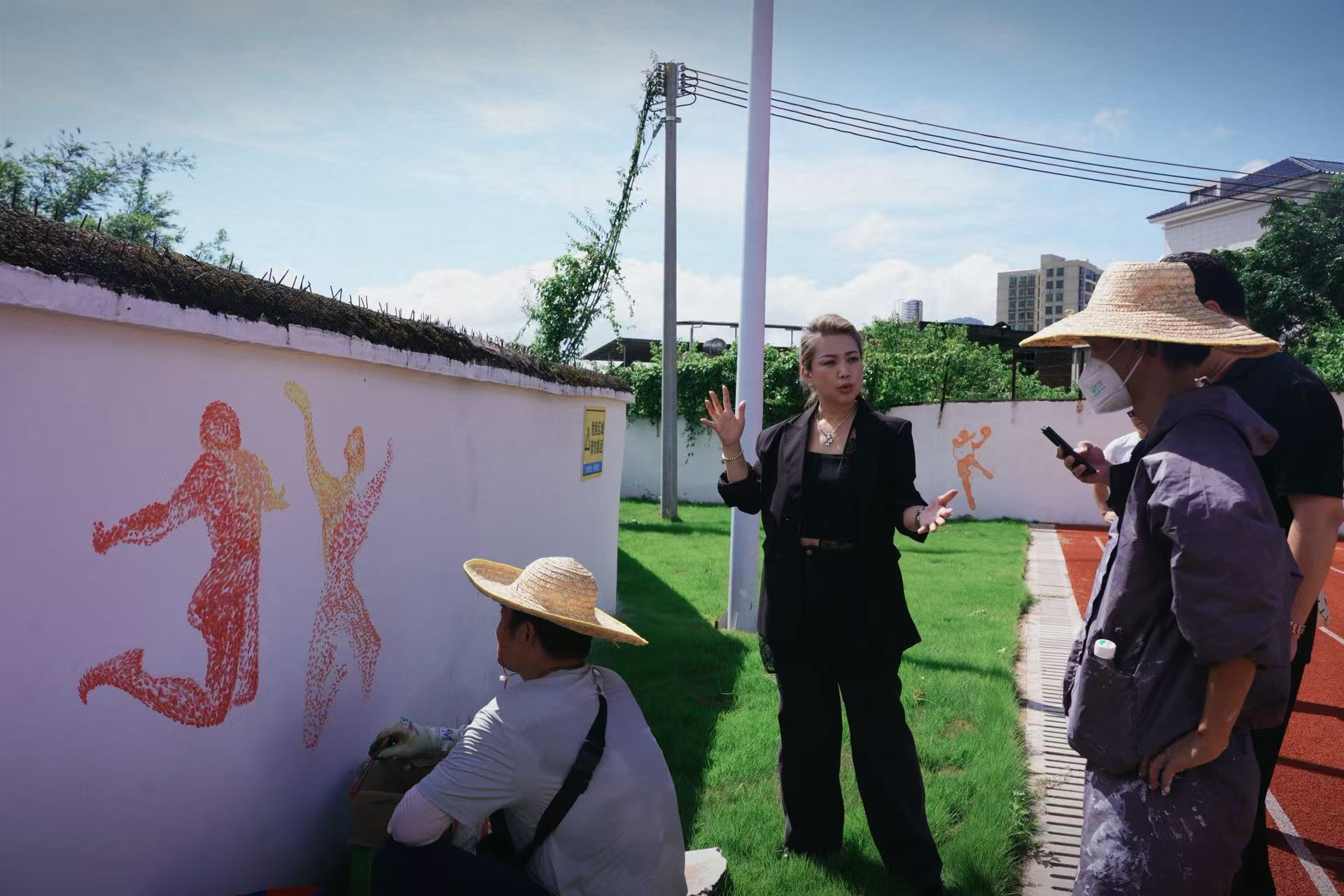 为确保活动实效,两校专门组建由师生构成的墙绘团队,前期通过实地调研精准测量场地尺寸,结合学校实际风貌设计初稿,并与省教育厅帮镇扶村工作组、凤安中学管理层反复沟通研讨,最终敲定实施方案。活动现场,广东外语外贸大学艺术学院王凯宏教授、暨南大学文化遗产创意产业研究院副院长叶志海教授等专家学者深入一线办公,针对图案造型、色彩搭配及与周边环境的协调性等关键问题给予专业指导,推动团队现场优化调整,全力保障墙绘工作高质量完成。