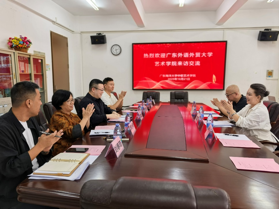 为深化校际交流与合作,介绍广东外语外贸大学艺术学院研究生培养情况,共促艺术学科高质量发展,10月20日至21日,广东外语外贸大学艺术学院院长王凯宏、副院长关雪仑、专硕教育中心主任肖楠楠一行,先后前往岭南师范学院、广东海洋大学开展调研交流活动,与两所高校相关学院展开深度对话。
