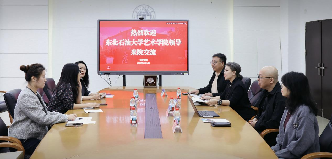 2025年11月4日,东北石油大学艺术学院教学副院长王婧一、舞蹈系主任韩丹、音乐系副主任孔夺等一行莅临我院访问交流。我院院长王凯宏、副院长关雪仑、公共教研部主任白波、音乐系主任赖菁菁共同接待了来访嘉宾。