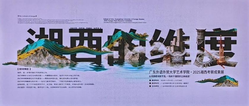 为贯彻落实学校关于加强实践教学与美育建设的相关要求,推动艺术设计教育与区域文化研究的深度融合,广东外语外贸大学艺术学院艺术设计系于近期举办了2025年(2023级)地域文化采风课程湘西写生成果展。展览主题为“湘西的维度”,以本年度湘西调研、写生及非遗体验教学为基础,系统呈现了学生在实践课程中的学习成果与阶段性探索,是广东外语外贸大学-湘西景森文化创意写生基地大学生社会实践教学基地的核心内容。