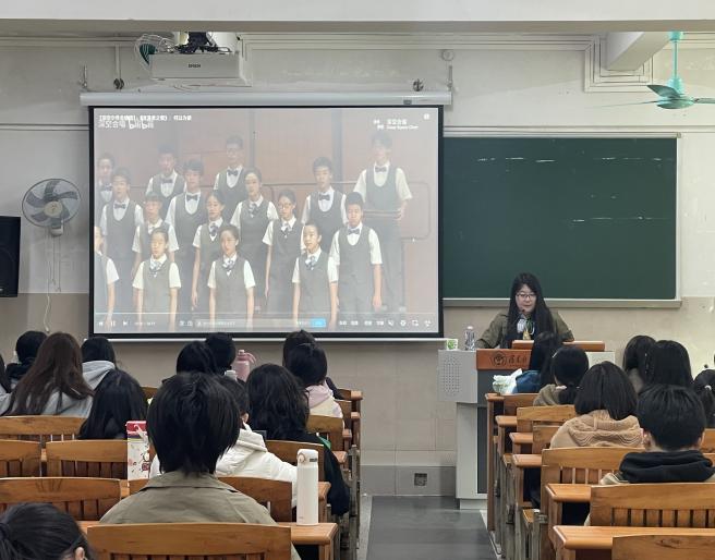 讲座以一段风趣的合唱作品《听音乐会不要讲话》开始,陈阳引导同学们思考,怎样才是好的音乐会聆听方式。她结合自身经历讲解了如何判断鼓掌时机,从节目单了解乐章结构、观察指挥的动作等知识,让大家意识到“懂得聆听,是快乐合唱的第一步”。在谈到合唱风格的多样性时,陈阳带领大家欣赏了彩虹合唱团《张士超你到底把我家钥匙放在哪里了》,由她创作的《星之幻象》《流浪者之歌》等代表性作品;从题材、风格到文化语境,分析当代合唱如何不断突破传统框架,散发出更开放多元的艺术魅力。