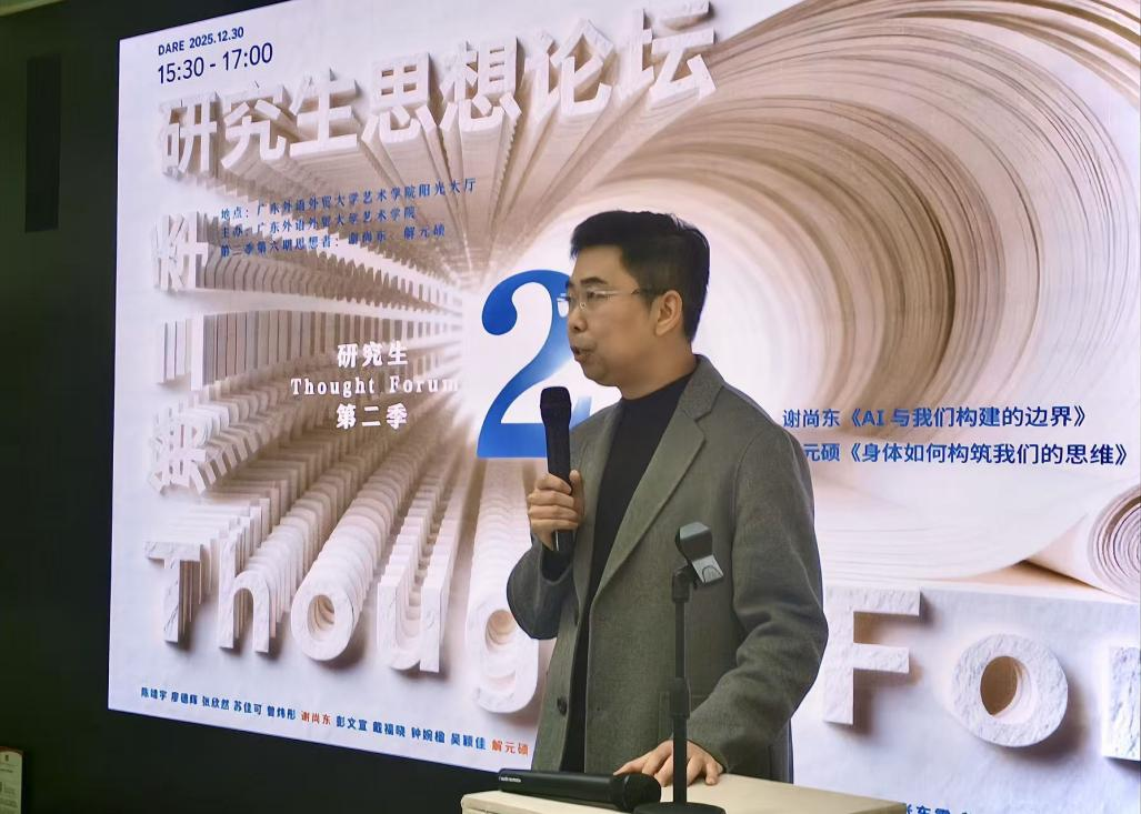 首先,由史琨副教授为谢尚东的主题开讲,谢尚东以“AI 与我们构建的边界”为主题进行了专题汇报。本次分享从人工智能的运行逻辑出发,结合工程实践与研究案例,系统探讨了人工智能能力的形成机制及其应用边界。