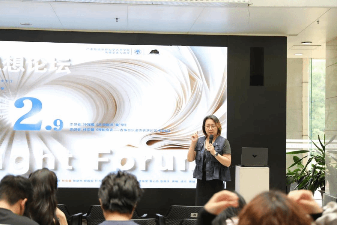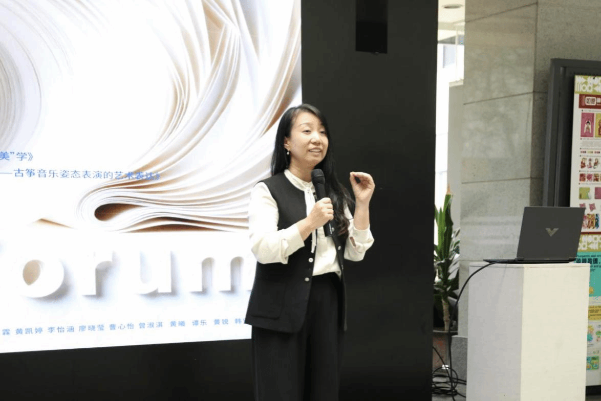 另一位思想者是音乐国际教育与传播专业的林奕馨,肖楠楠副教授为她的选题做了开场引导。她首先介绍了林奕馨同学的主题---《筝韵身姿——古筝音乐姿态表演的艺术表达》随后,她指出,钢琴、声乐等专业之所以称为“表演方向”,正是因为不仅有“奏唱”,还有“演”。古筝演奏承载着听觉艺术与动态的视觉艺术,达尔克罗兹最早强调姿态与音乐的关系,宋代的《琴论》也层提出“指法贵简静,要须气韵生动。”只有听觉艺术与视觉艺术相结合,才能形成气韵生动的表达。她总结道,如何实现听觉艺术与动态视觉艺术的高度融合,呈现出“气韵生动”的境界,正是林奕馨同学将要探讨的核心问题。