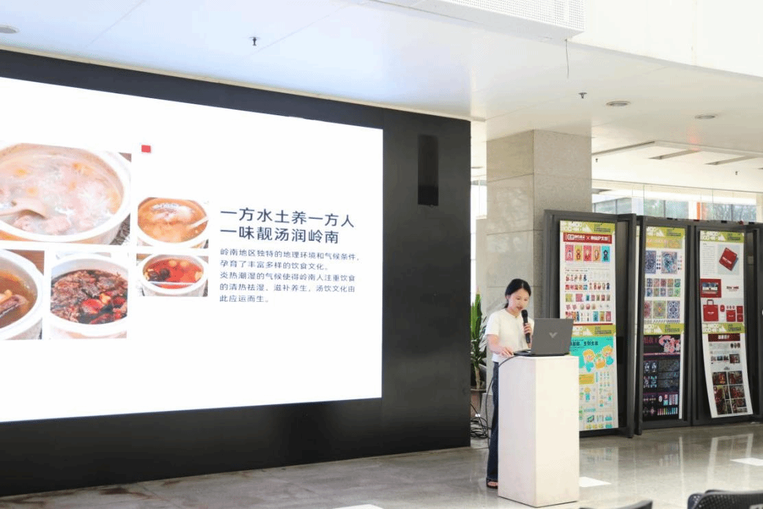 视觉艺术设计方向研究生钟婉楹以《从汤到汤“美”学》为主题进行了精彩演讲。在演讲中,钟婉楹以广府汤饮为切入点,从岭南地理气候、家庭情感仪式、中医哲学智慧三个层次,深度解读老火汤承载的岭南文化内核,药食同源、顺时而食则蕴含传统阴阳平衡的哲学思想,让一碗汤成为兼具实用、情感与文化价值的生活载体。