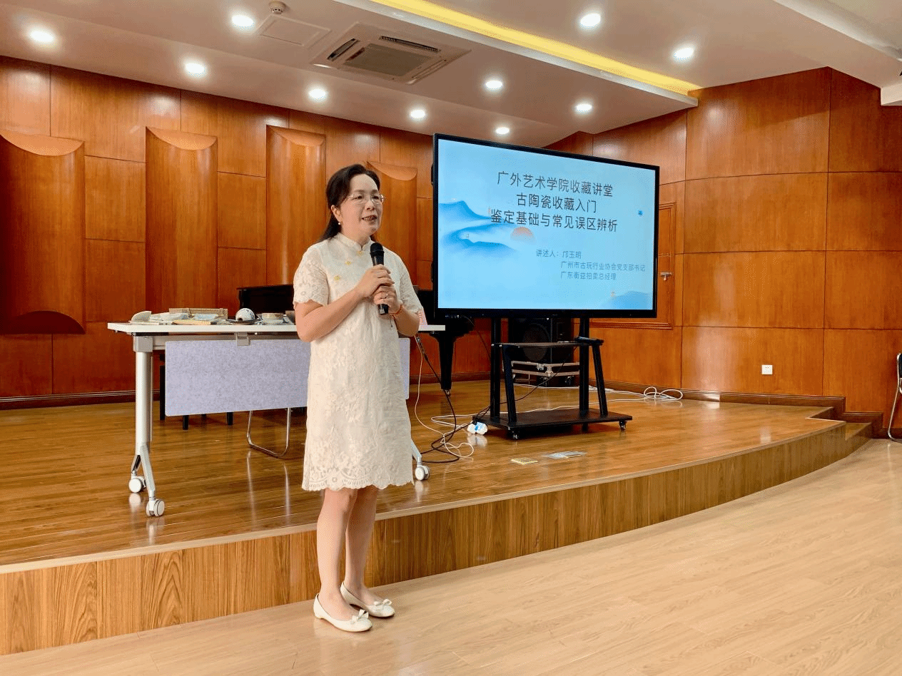 为拓宽学生知识视野,涵养多元人文素养,广外艺术学院近日特邀广州市收藏协会资深专家邝玉明女士,为学院师生带来了一场别开生面的专题讲座。讲座主题为《古陶瓷收藏入门-鉴定基础与常见误区辨析》,现场座无虚席,气氛热烈。王凯宏院长参加本次讲座,我院公共教研部主任白波教授作为学术主持。