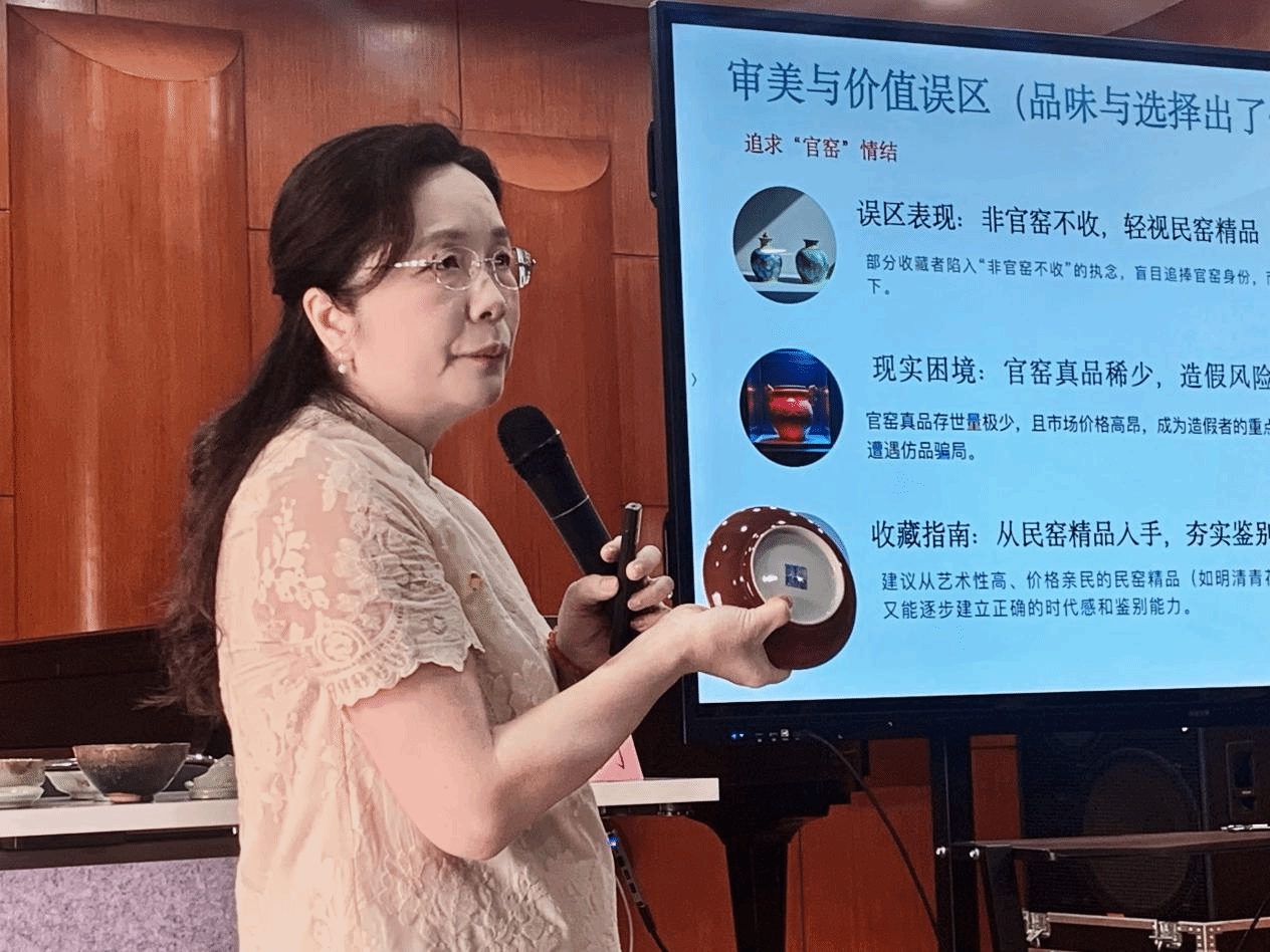 随后,结合自身多年的收藏经验,邝女士重点剖析了古陶瓷收藏中常见的误区——如重“名”轻“真”、盲目追“古”、忽略品相等,并针对性地提出了独到见解。她特别强调,收藏者应当“以年代为基石,以艺术为准绳”,逐步建立起属于自己的收藏体系,而非盲目跟风或追逐市场热点。讲座过程中,邝女士还展示了多件高仿标本与真品对比图片,引导同学们近距离观察胎釉、纹饰与款识的细微差别,现场互动频频,掌声不断。