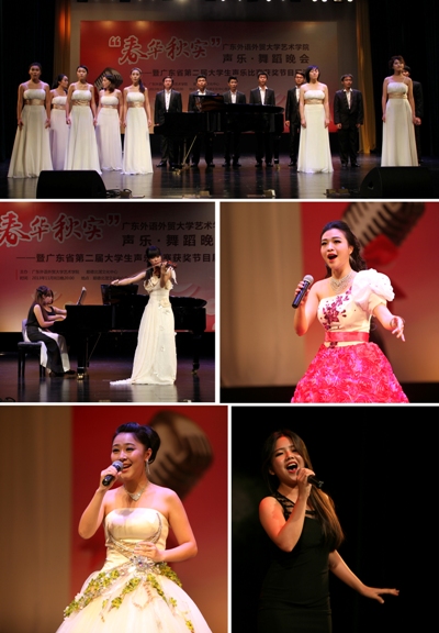 演出作为学校本科教学质量月的活动之一,学院领导高度重视,副院长罗金燕、系部主任李志刚、王蓓等师生们连日来,不辞辛苦,克服困难,精心组织,主要选送了我院学生在广东省第二届大学生声乐比赛中的获奖节目及近两年其它类型声乐比赛的获奖作品进行展演,同学们的精彩表演得到了观众们的热烈欢迎和一致好评。