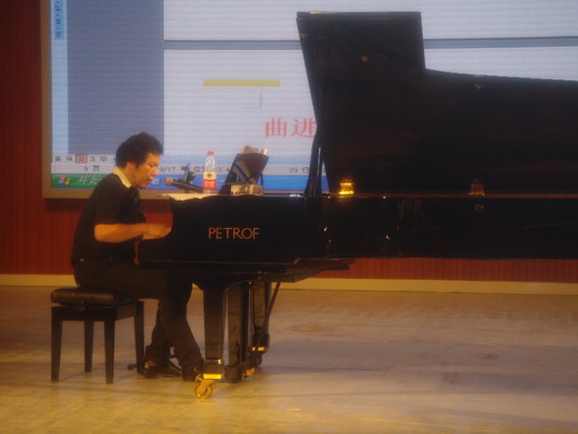 讲座开始,蔡常青以一曲《吻别》拉开了教学音乐会的序幕,接着由十多首古今中外曲目的即兴演绎一气呵成串联在一起。在九尺大三角钢琴上蔡常青表演了古典风格的《车尔尼599练习曲》即兴移调变奏、今年春晚流行金曲《风吹麦浪》钢琴弹唱、新疆民歌《掀起你的盖头来》爵士版改编弹唱与演奏、巴西民歌《在路旁》和中国流行曲《弯弯的月亮》的即兴演奏等。讲座采取互动的形式,内容围绕着如何选择和声、织体、转调、移调等一系列即兴伴奏的相关知识展开。讲座内容深入浅出,丝丝入扣,受到了师生门的热烈欢迎。