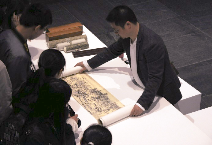 此次活动由广东美术馆和我院艺术设计系共同举办,是一次美术馆艺术品鉴赏活动和高校艺术教学合作的有益尝试。与以往的展览形式不同,此次展出的作品仅有手卷与册页,且全都存放于画案上的画匣中。参观者可如古代画家文人那样,亲手轻启卷画,与艺术家共同品茗清谈雅趣。