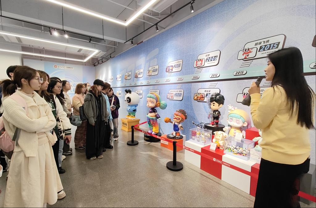 师生一行首先参观了潮玩中心的二层展厅。参观过程中,展厅讲解员向师生们详细介绍了潮玩中心的基本概况、东莞本土原创潮玩IP和石排镇潮玩特色产业等内容,让学生们对潮玩IP开发有了更深入的了解和认识。
