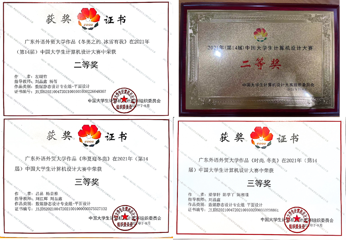 第14届中国计算机设计大赛全国总决赛近日落下帷幕。我院艺术设计系2019级数媒专业的左缇竹同学的参赛作品《冬奥之约.冰雪有我》在作品展示、决赛答辩中发挥出色,荣膺数媒静态设计专业组二等奖。此外,我院艺术设计系2019级视传专业的吕品、杨芸雅同学的参赛作品《华夏迎冬奥》和2020级视传专业的梁肇轩、陈学丫、陈湘瑾同学的《时尚.冬奥》 获得数媒静态设计专业组三等奖。