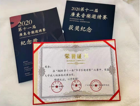“2020第十一届广东音乐邀请赛”由广东省音乐家协会、广州市文学艺术界联合会、广州市音乐家协会、广州管乐协会主办。艺术学院2019级国际音乐教育与传播(音乐学)学生周舟和黄诗瑶分别获得大学成人(西洋乐)组“金奖”和“铜奖”,艺术学院艺术管理与舞蹈系副教授宋比多获得“优秀指导教师奖”。
