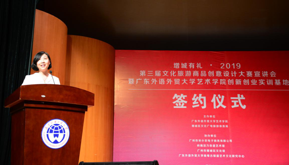 6月19日下午,2019增城第三届文化旅游商品创意设计大赛宣讲会暨广东外语外贸大学艺术学院创新创业实训基地签约仪式在我院举行,增城区文化广电旅游体育局、区旅游发展中心、区文化馆主要负责人,南方报业集团、广州大湾区文化促进中心相关负责人,艺术学院党总支书记麦培年、主持工作副院长王凯宏、副院长李志刚、陈燕敏、总支书记副书记张莉以及艺术学院部分师生参与活动。