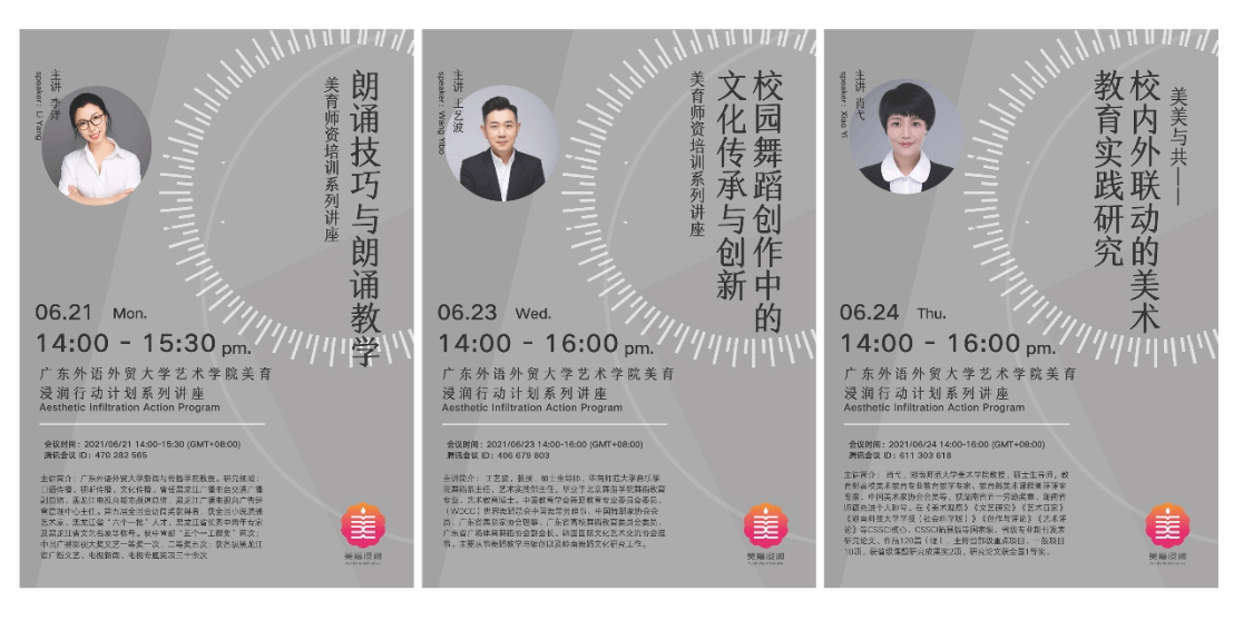 为落实广东省教育关于美育浸润行动计划的文件要求,提高帮扶地区美育师资水平,促进帮扶地区美育教育发展,克服疫情所带来的困难,广东外语外贸大学艺术学院在2021年6月21日至24日举办了三场线上美育师资培训活动。此次活动邀请广东外语外贸大学新闻与传播学院李洋教授、华南师范大学音乐学院王艺波教授、湖南师范大学美术学院肖弋教授分别作了三场精彩的美育师资培训。