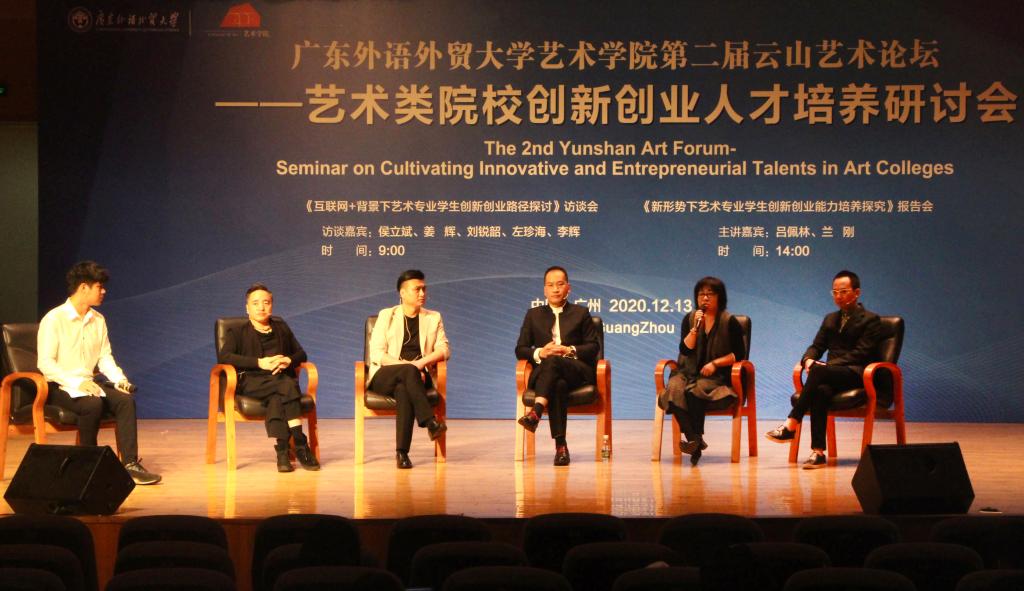 本届论坛以创新创业人才培养为主题,邀请了多名艺术行业翘楚精英齐聚广外。研讨会分两个阶段进行:上午为《互联网+背景下艺术专业学生创新创业路径探讨》访谈会,由侯立斌(北京设技桥教育科技研究院院长、泰国格乐大学艺术教育研究中心执行主任)、李辉(内蒙古设技桥教育科技研究院院长)、左珍海(贵州设技桥教育科技研究院院长、贵州得一设计集团董事长)、姜辉(广州集美室内设计工程有限公司总经理)、刘锐韶(广东锐美集思设计股份有限公董事长)五位专家担任访谈嘉宾,下午为《新形势下艺术专业学生创新创业能力培养探究》报告会,由吕佩林(中国管理科学研究院城市发展战略研究所常务副所长)、兰刚(广州金信子文化传播有限公司董事、总经理)担任主讲嘉宾。