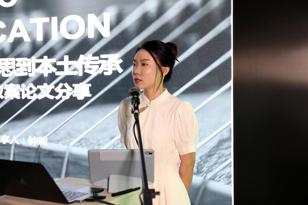 钟莉的分享主题为“从对话哲思到本土传承”。她从雷默与埃利奥特音乐教育哲学思想的对话中,提炼出联动沉浸式音乐教学思维,由此撰写相关论文,提出一系列教学策略。继而,她将此理论成果运用于实践,向大家展示了获奖教案,并分享其在教案撰写过程中如何结合理论成果不断思考和创新。