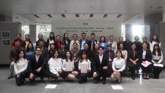 12月26日上午,广东外语外贸大学培育和践行社会主义核心价值观“铸魂•系扣”工程项目暨红色文化节之“初心之路”书画摄影主题展在我校艺术楼一楼展厅开幕。展览由我校党委宣传部主办,我院承办。校党委常委、副校长刘海春,艺术家代表,校党委宣传部部长谢秀兰,校特聘组织员代表,校团委的领导,二级学院党委、图书馆党总支部的书记、副书记,以及艺术学院师生代表出席了开幕式。开幕式由学院党总支书记麦培年主持。