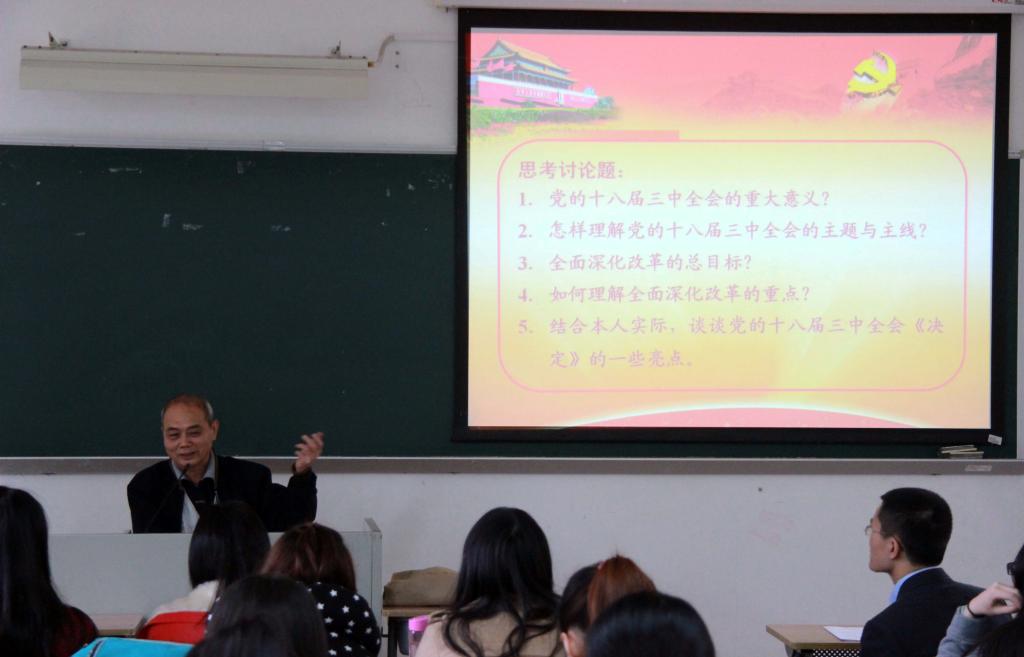 冯益谦主要为大家解读了党的十八届三中全会的重要性、议题、改革内容、意义等内容。他在阐述了此次会议的重大意义时指出:“党的十八届三中全会,是在我国改革开放新的重要关头召开的一次重要会议”。他特别强调全面深化改革与之前提出的改革不同在于,本次改革将从经济体制、政治体制、文化体制、社会体制、生态体制以及党建六个方面进行全方位改革。他还特别分析了本次改革的几个重点,“市场在资源配置中起决定性作用意味着什么?”“廉政与市场经济制度完善有关系么?”在冯益谦一系列的设问和解读中,同学们对十八届三中全会的精神和意义有了更深的了解和思索。
