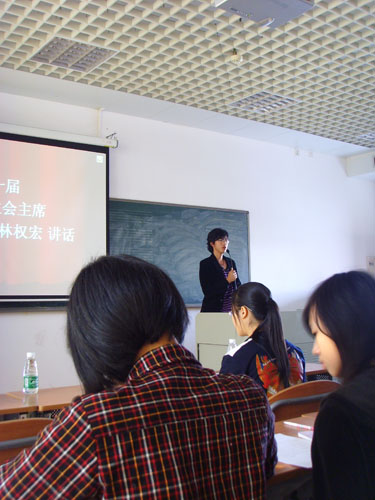 紧接着,就到了会议的经验分享环节。在这个环节中,分别由上一届的优秀干事孔媛媛和李衡,以干事的角色和眼光,与在场的新干事进行经验交流。孔媛媛同学的“在困境中思考,在思考中明志,在明志中奋进”和李衡同学认为的“细节决定成败”等,无不让新干事们体会良多。