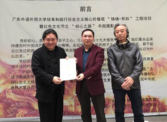 12月26日上午,广东外语外贸大学培育和践行社会主义核心价值观“铸魂•系扣”工程项目暨红色文化节之“初心之路”书画摄影主题展在我校艺术楼一楼展厅开幕。展览由我校党委宣传部主办,我院承办。校党委常委、副校长刘海春,艺术家代表,校党委宣传部部长谢秀兰,校特聘组织员代表,校团委的领导,二级学院党委、图书馆党总支部的书记、副书记,以及艺术学院师生代表出席了开幕式。开幕式由学院党总支书记麦培年主持。