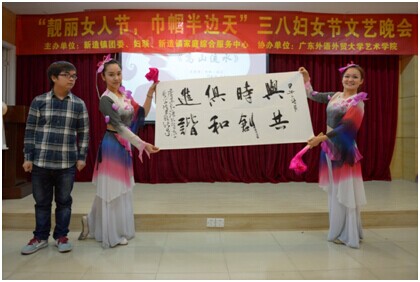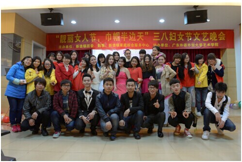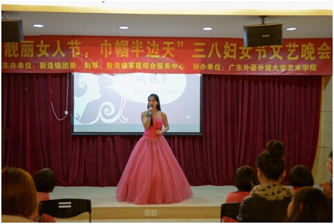 3月8日晚上7:30,由新造镇团委,妇联,新造镇家庭服务中心主办,广东外语外贸大学艺术学院协办的三八妇女节慰问文艺晚会“靓丽女人节,巾帼半边天”在新造镇妇女之家温暖举行。