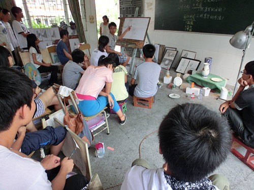 美术组的队员每天下午对美术专业的同学们进行讲授素描、色彩等基础课程。多样的讲课形式、生动形象的现场演示,都让学生们受益良多。经过几天的相处,我们“老师”与学生们之间建立了深厚的感情,也营造了浓厚的学习氛围。