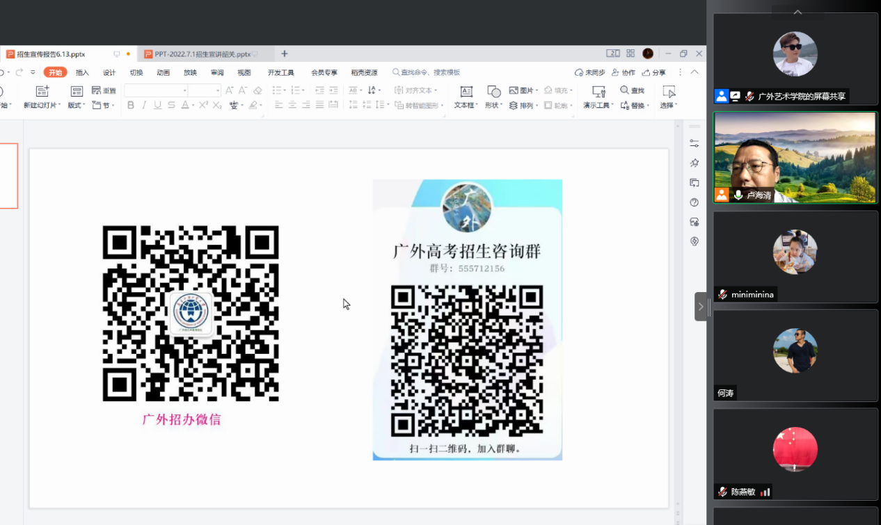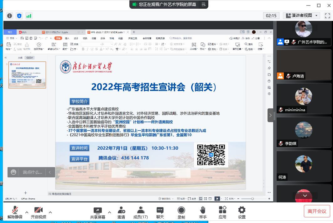 学院还与韶关乐昌一中、翁源中学等建立联系。7月1日上午10:30开通腾讯会议,对韶关市北江中学、市一中、乳源高级中学、乐昌一中、翁源中学等进行线上招生宣传及线上答疑,我院招生宣传工作组参加了本次线上答疑。